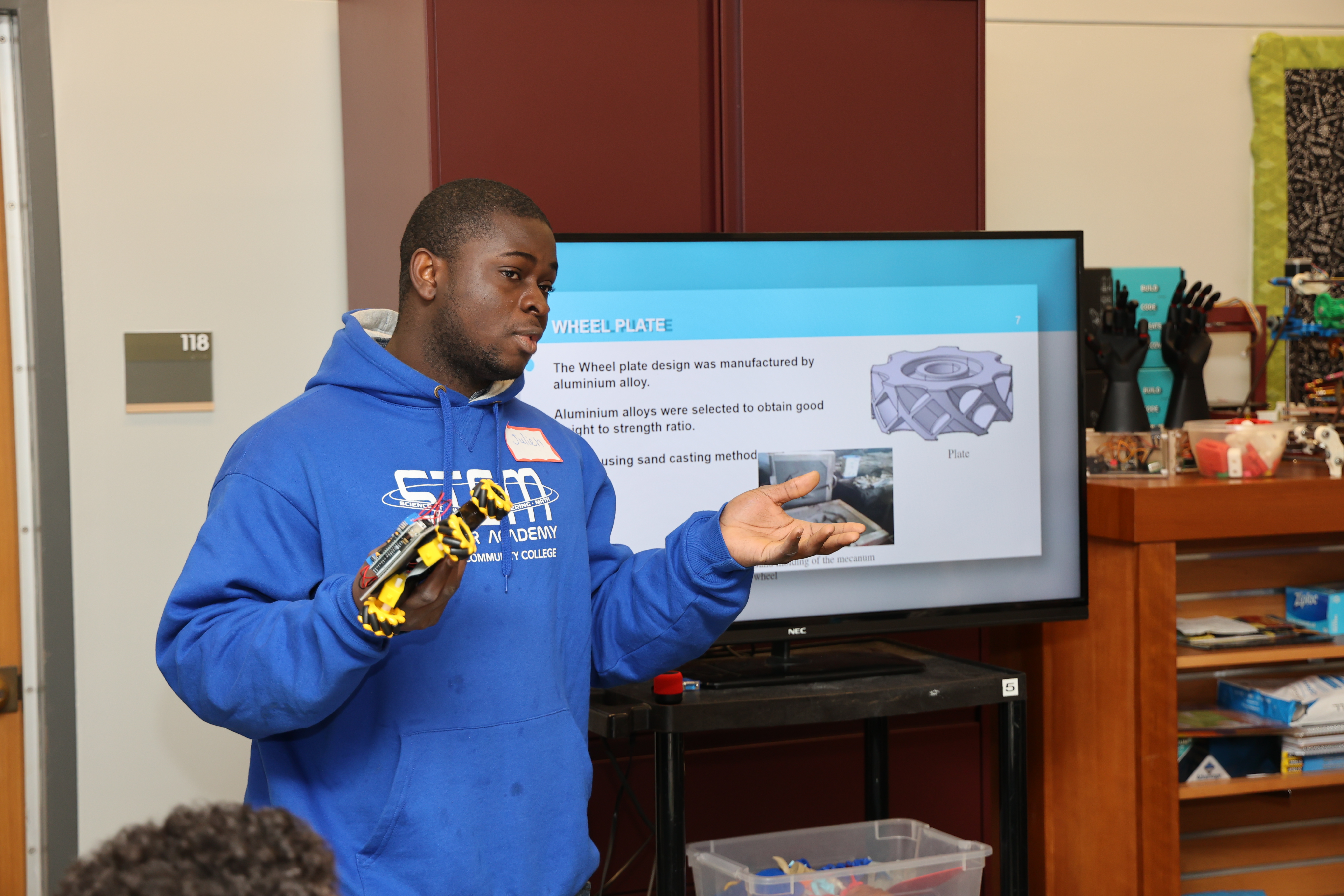NSF Scholar Julian worked with NSF Scholar Tyler to create a fun and interactive presentation to introduce High School students to the topic of 3d Printing. This presentation included introducing what 3d is, the process of setting up a printer, and showing the students how with 3D printing, Julian and Tyler were able to create their a working RC car.